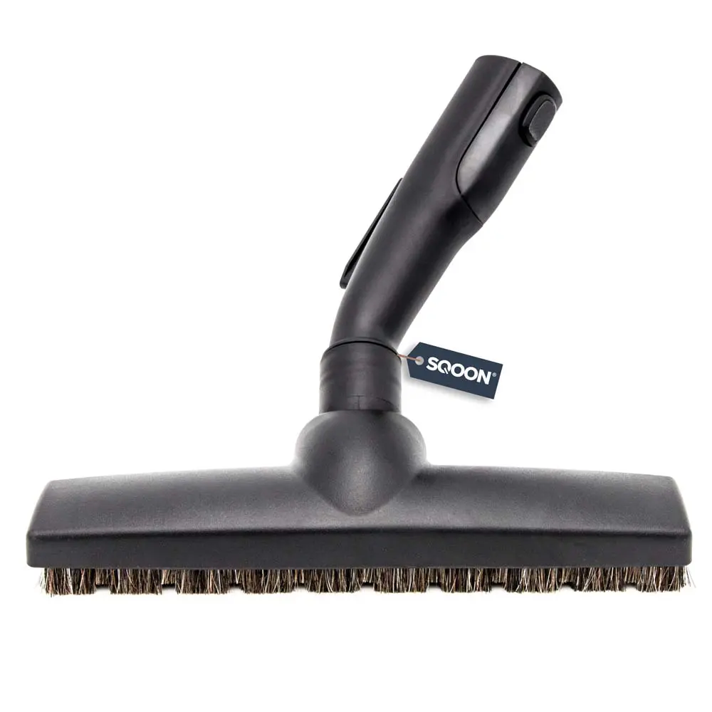 Aansluiting ovaal AEG. Met parkeerstand. Extra lang natuurhaar. Met 3 rubberen wieltjes. Door scharnierbare knie mogelijkheid onder lage objecten te zuigen.